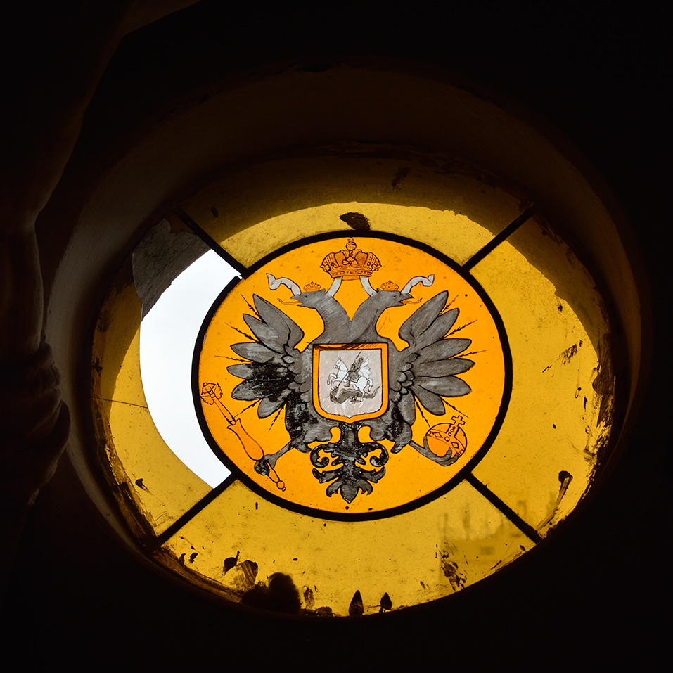 - Também na fachada principal da Vila Itororó veem-se diversos vitrais circulares, além da inscrição MCMXXII – a data de inauguração do complexo. / One of several Vila Itororó´s circular stained glasses can also be seen on the main façade, besides the inscription MCMXXII – the date on which the complex was inaugurated.