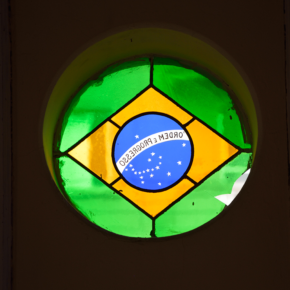- Também na fachada principal da Vila Itororó veem-se diversos vitrais circulares, além da inscrição MCMXXII – a data de inauguração do complexo. / One of several Vila Itororó´s circular stained glasses can also be seen on the main façade, besides the inscription MCMXXII – the date on which the complex was inaugurated.