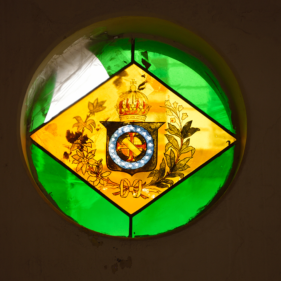 - Também na fachada principal da Vila Itororó veem-se diversos vitrais circulares, além da inscrição MCMXXII – a data de inauguração do complexo. / One of several Vila Itororó´s circular stained glasses can also be seen on the main façade, besides the inscription MCMXXII – the date on which the complex was inaugurated.