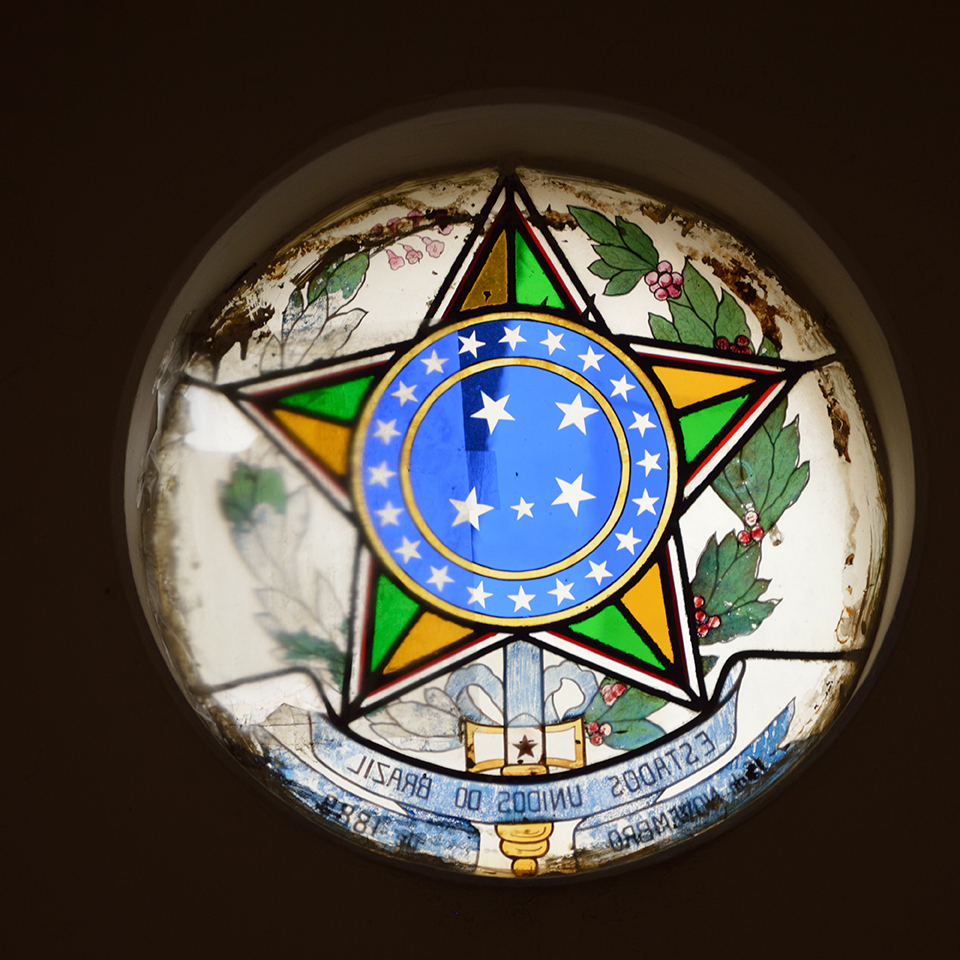 - Também na fachada principal da Vila Itororó veem-se diversos vitrais circulares, além da inscrição MCMXXII – a data de inauguração do complexo. / One of several Vila Itororó´s circular stained glasses can also be seen on the main façade, besides the inscription MCMXXII – the date on which the complex was inaugurated.