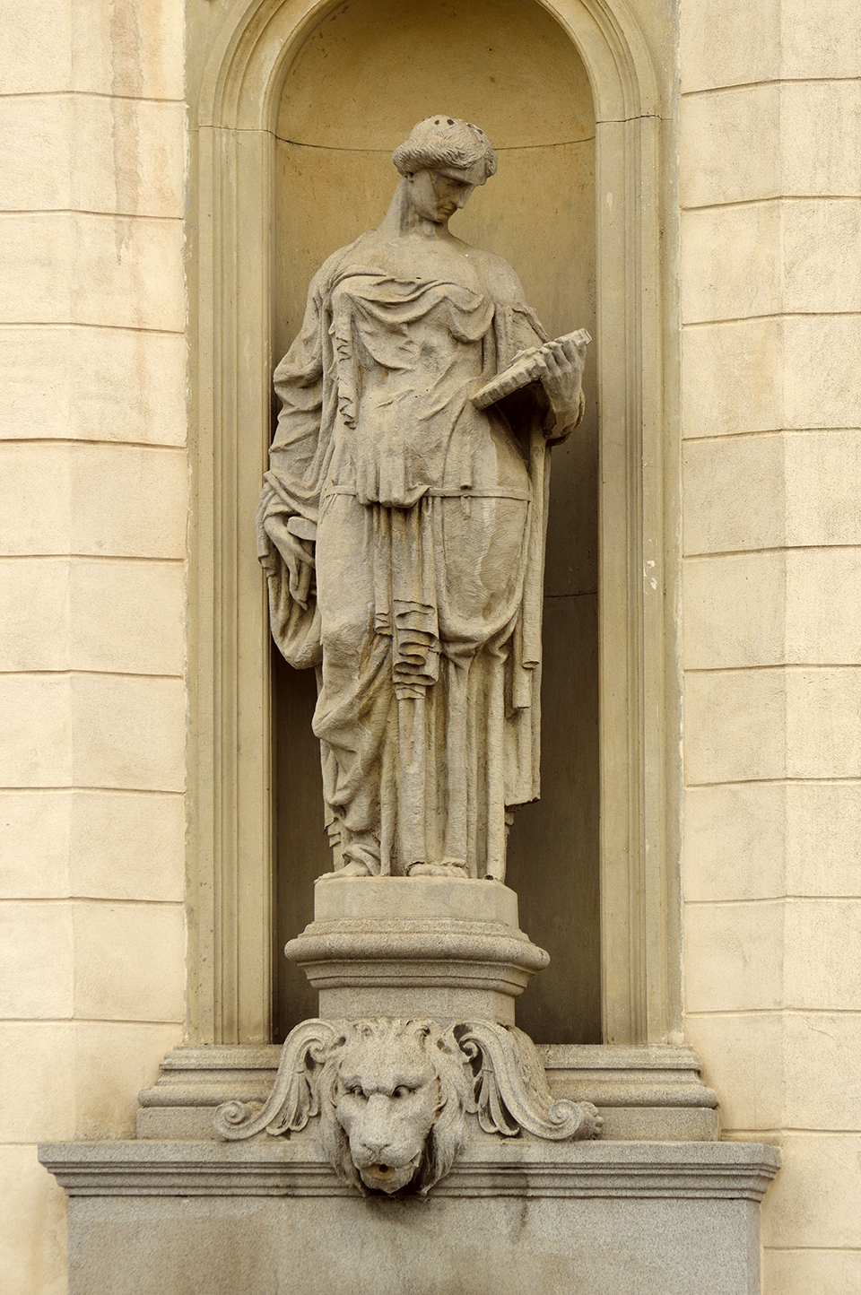 A Alegoria do Comércio segura com a mão esquerda o caduceu de Mercúrio – nele impressa a própria face alada do deus romano. Na mão direita ela porta um livro, provavelmente alusivo à justiça no Comércio.