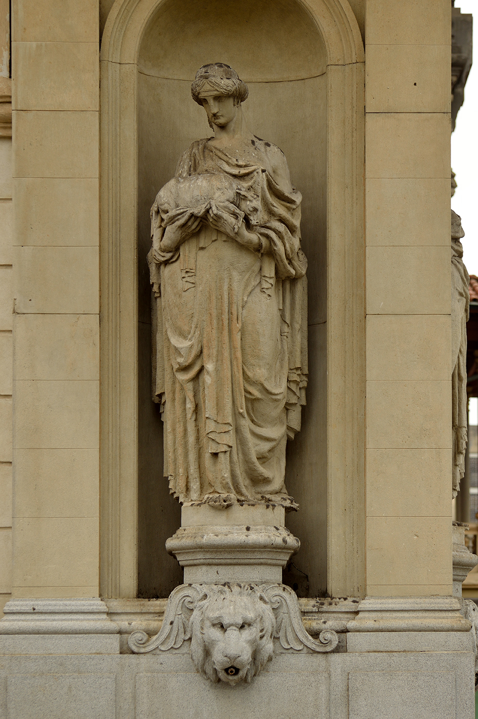 A Alegoria do Comércio segura com a mão esquerda o caduceu de Mercúrio – nele impressa a própria face alada do deus romano. Na mão direita ela porta um livro, provavelmente alusivo à justiça no Comércio.