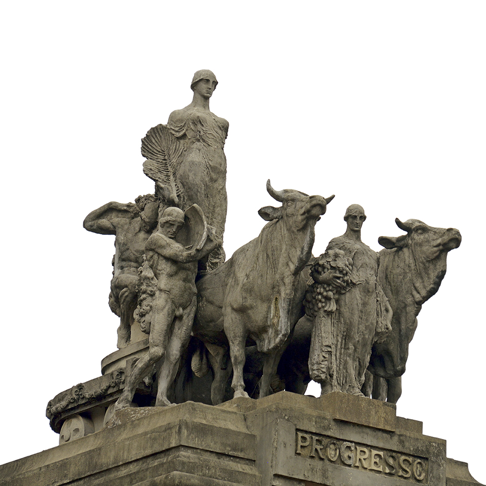 A Alegoria da Indústria carrega consigo o malho (marreta) e uma engrenagem.